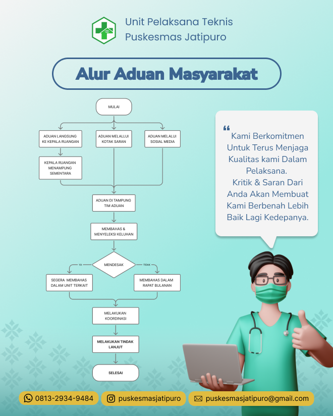 UPT Puskesmas Jatipuro berkomitmen untuk terus meningkatkan mutu pelayanan kesehatan melalui keterbukaan terhadap masukan, kritik, dan saran dari masyarakat.