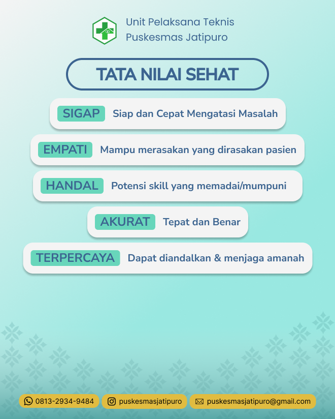 Nilai-nilai ini menjadi pedoman perilaku dan semangat kerja seluruh tenaga kesehatan di Puskesmas Jatipuro: