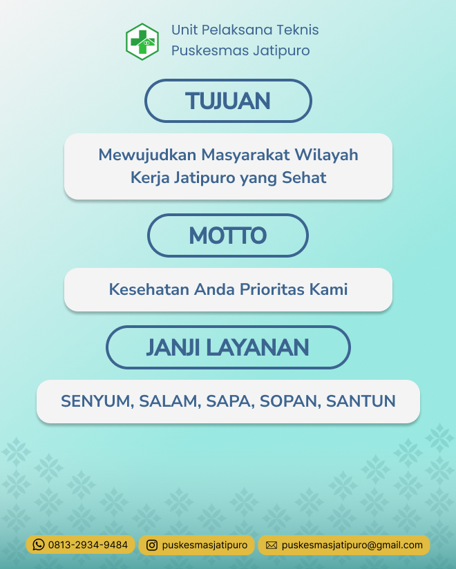 Visi ini menjadi arah dan cita-cita besar seluruh tenaga kesehatan serta staf UPT Puskesmas Jatipuro dalam membangun pelayanan kesehatan yang menyentuh seluruh lapisan masyarakat.